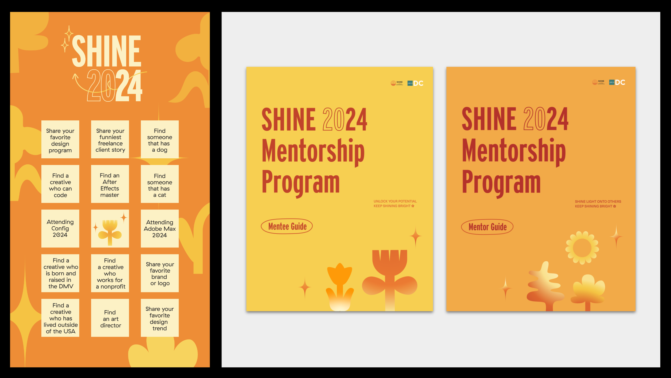 SHINE is a four-month mentoring program that connects mentors and mentees within the DMV design communities. Participants join to challenge each other to grow, focus on portfolio development, or collaborate on projects of their choice. As the Mentorship Chair for the 2024 cohort of 40 people, I art directed the brand identity in collaboration with designers Kim Bariring and May Park. I led a dedicated 6 person volunteer committee to bring the in-person programming and events to life.